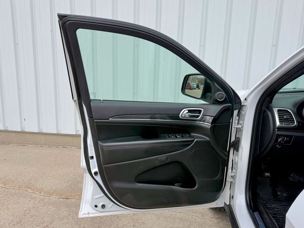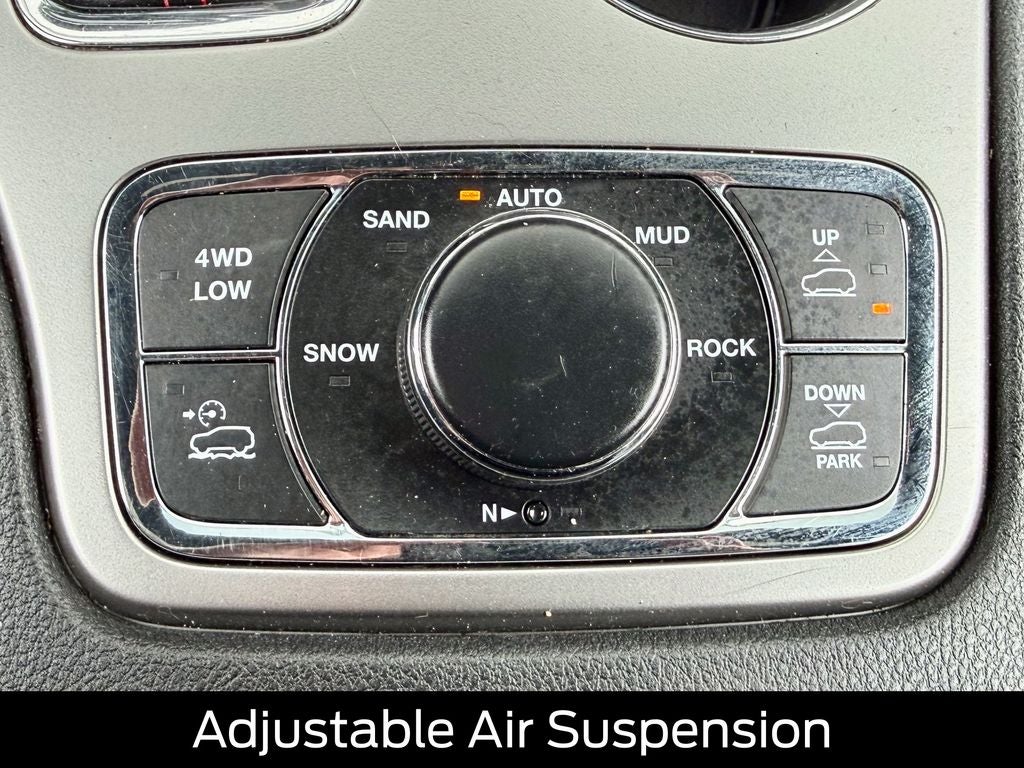 The purpose-built Trailhawk trim outfits the Grand Cherokee with distinctive 18-inch aluminum wheels, all-terrain tires, and unique red tow hooks. Inside, you'll find premium cloth and leather-trimmed seating surfaces with heated and ventilated front seats, a heated leather-wrapped steering wheel, and rugged interior accents. The spacious cabin offers 36.3 cubic feet of cargo space behind the second row-expandable to 68.3 cubic feet with the rear seats folded, along with dual-zone automatic climate control and a 6-speaker premium audio system for your journeys.