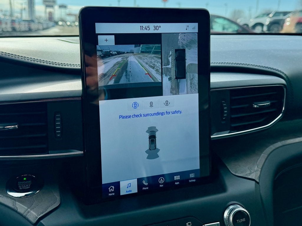 The pinnacle Platinum trim outfits the Explorer with distinctive 21-inch polished aluminum wheels, all-season touring tires, and a unique black mesh grille with satin aluminum accents. Inside, you'll find premium semi-aniline leather seating with heating and ventilation for the front row, a leather-wrapped steering wheel, and authentic open-pore wood interior trim. The versatile three-row cabin offers best-in-class second-row legroom and abundant cargo space, along with tri-zone automatic climate control and a premium 14-speaker B&O Sound System by Bang & Olufsen.