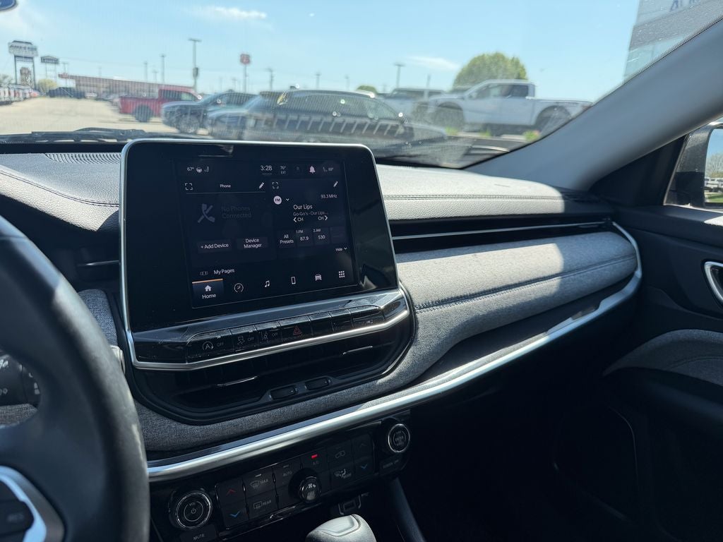 The well-equipped Latitude trim outfits the Compass with distinctive 17-inch aluminum wheels, all-season tires, and signature LED lighting with a premium grille. Inside, you'll find premium leather and cloth seating surfaces, a leather-wrapped steering wheel with audio controls, and contemporary interior accents. The versatile and spacious cabin offers comfortable seating for five and generous cargo space, along with automatic climate control and a 8.4-inch touchscreen Uconnect infotainment system.