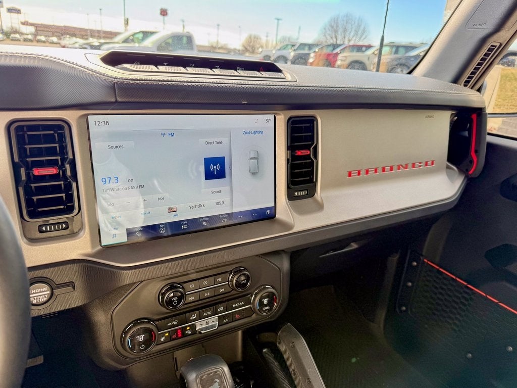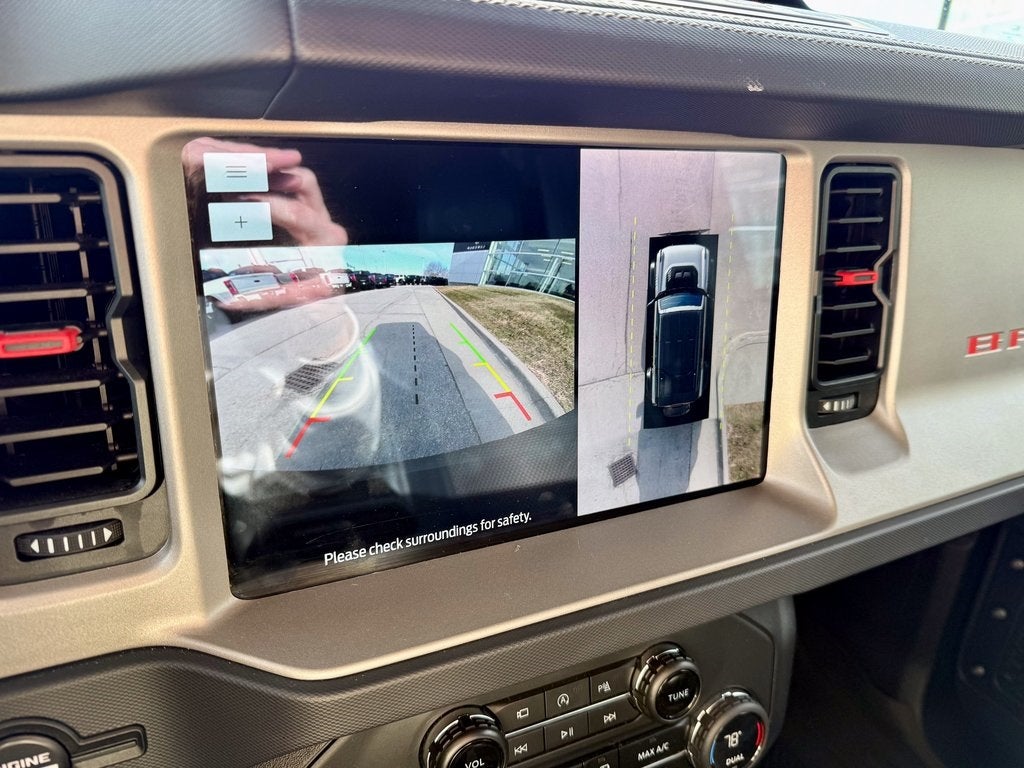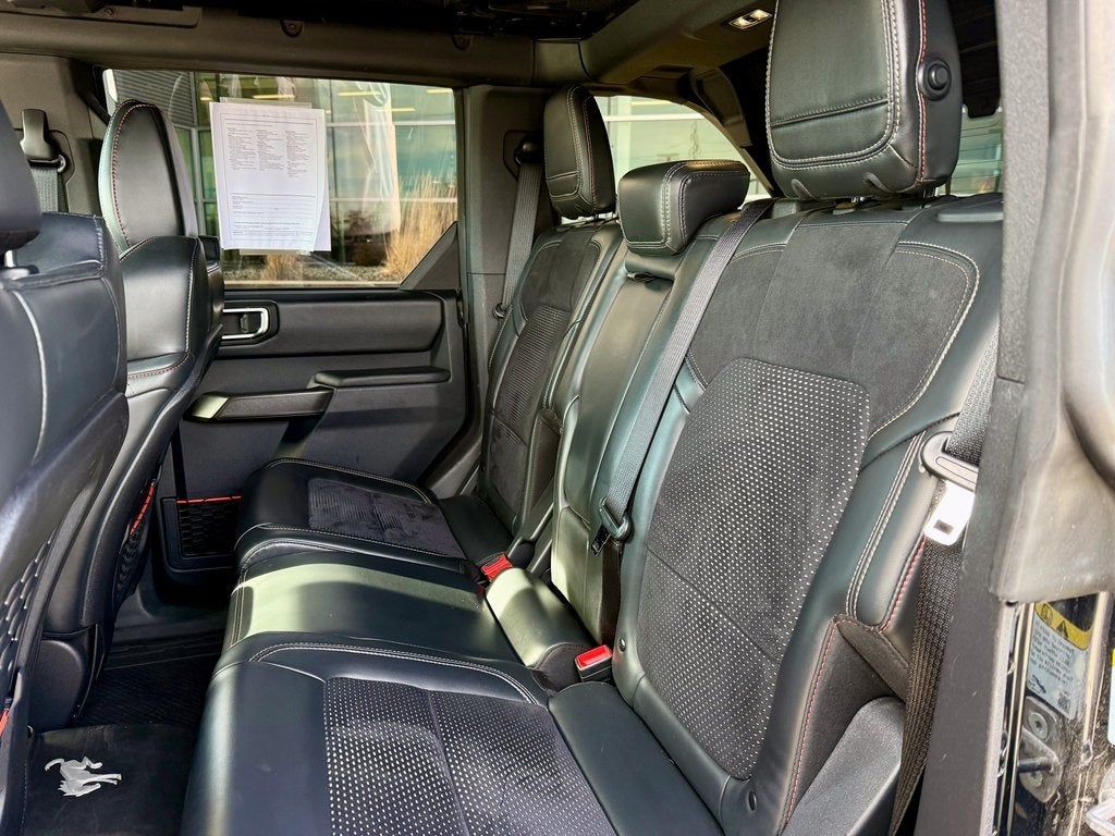 The purpose-built Raptor trim transforms the Bronco with 17-inch aluminum wheels, FOX Live Valve 3.1 Internal Bypass Semi-Active Dampers, and an aggressive modular front bumper. Inside, you'll find premium leather-trimmed and suede seating surfaces with heated and ventilated front seats, a leather-wrapped steering wheel, and unique Raptor instrumentation. The versatile cabin offers ample cargo space for gear, along with available dual-zone automatic climate control and a 10-speaker B&O Sound System by Bang & Olufsen for an exhilarating experience.