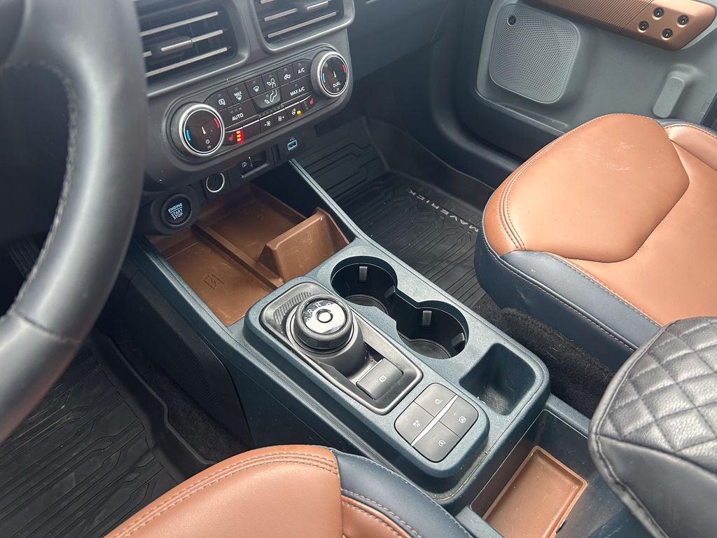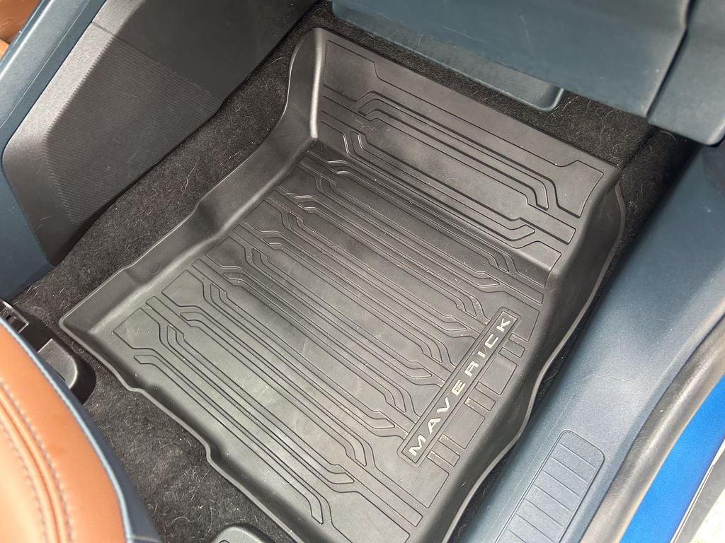 The upscale Lariat trim outfits the Maverick with distinctive 18-inch machined aluminum wheels, all-season tires, and a signature chrome-accented grille with LED lighting. Inside, you'll find premium leather-trimmed seating surfaces with heated front seats, a leather-wrapped steering wheel with mounted controls, and elegant interior accents. The versatile Crew Cab offers comfortable seating for five and the innovative Flexbed cargo system, along with dual-zone automatic climate control and an 8-inch touchscreen SYNC 4 infotainment system.
