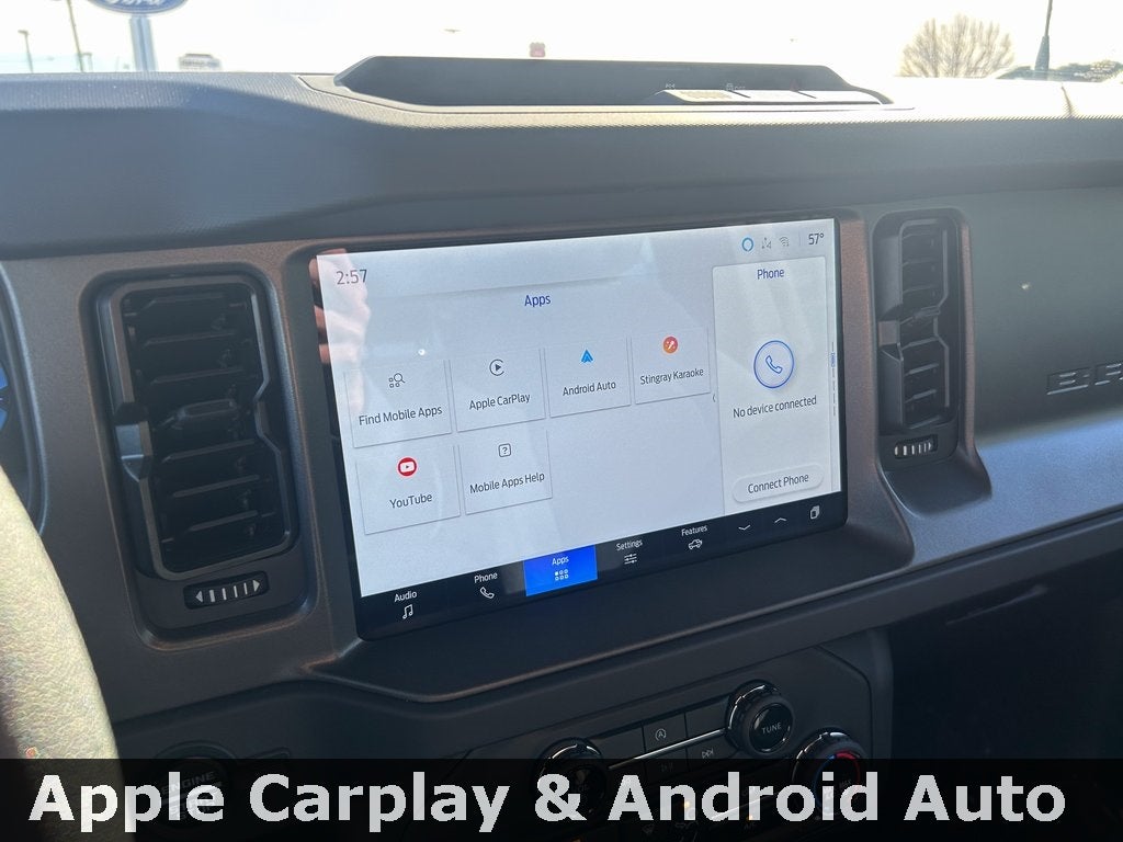 Essential technology features include the SYNC 4 infotainment system with an 8-inch touchscreen supporting Apple CarPlay and Android Auto. The Bronco Base also boasts class-exclusive Trail Turn Assist for enhanced control and confidence on any terrain.